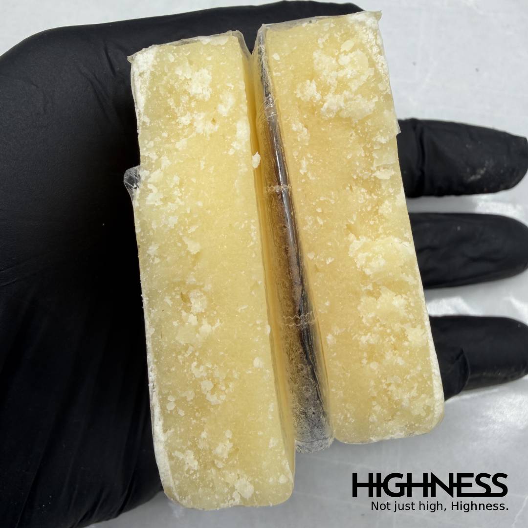 L'hashish Granita è uno spettacolo di consistenza e colore. Presenta una tonalità marrone-dorata, spesso più chiara dell'hashish tradizionale, grazie al contenuto di crumble ad alta purezza e all'abbondanza di tricomi. La texture è la sua caratteristica distintiva: è allo stesso tempo compatta e facilmente sminuzzabile ("crumble"), rendendola semplice da maneggiare e utilizzare. Questa consistenza unica è il risultato diretto del meticoloso processo di miscelazione, che mette in mostra un'alta concentrazione di metaboliti cristallini.
